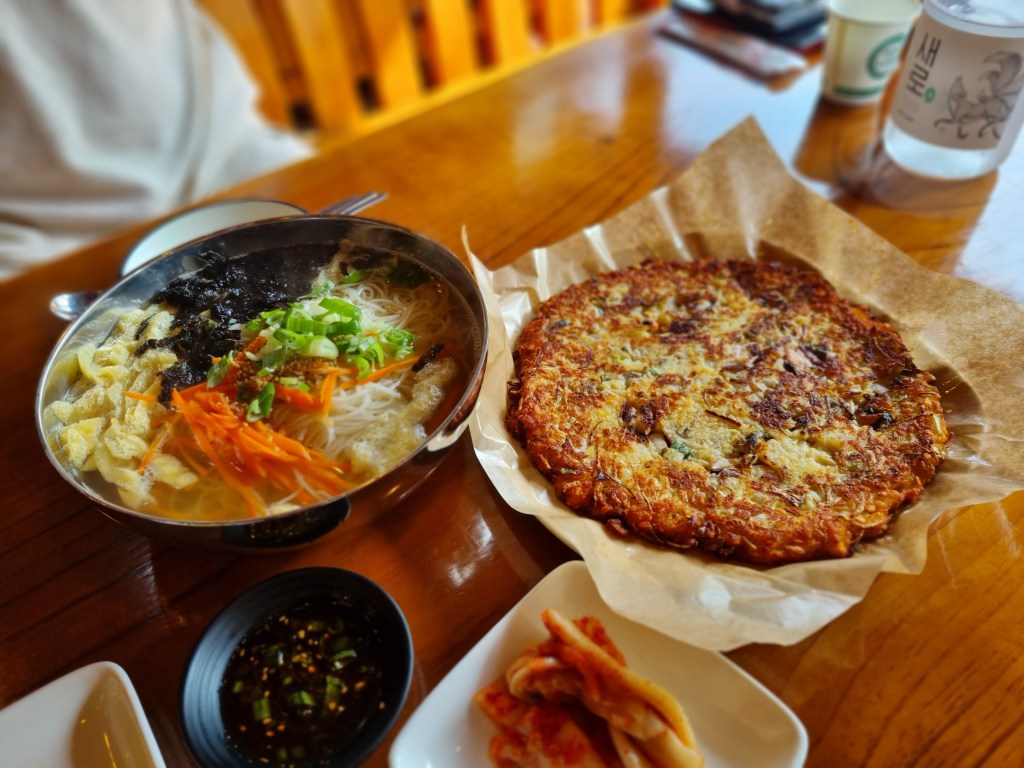 We had Janchi-guksu (잔치국수, translates to ‘feast noodles’) and Bindae-tteok (빈대떡, mung bean pancakes). They’re both simple dishes, quite often found in market, so I didn’t expect these common dishes to taste so great.